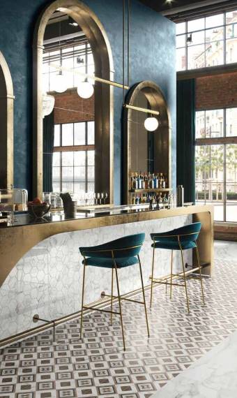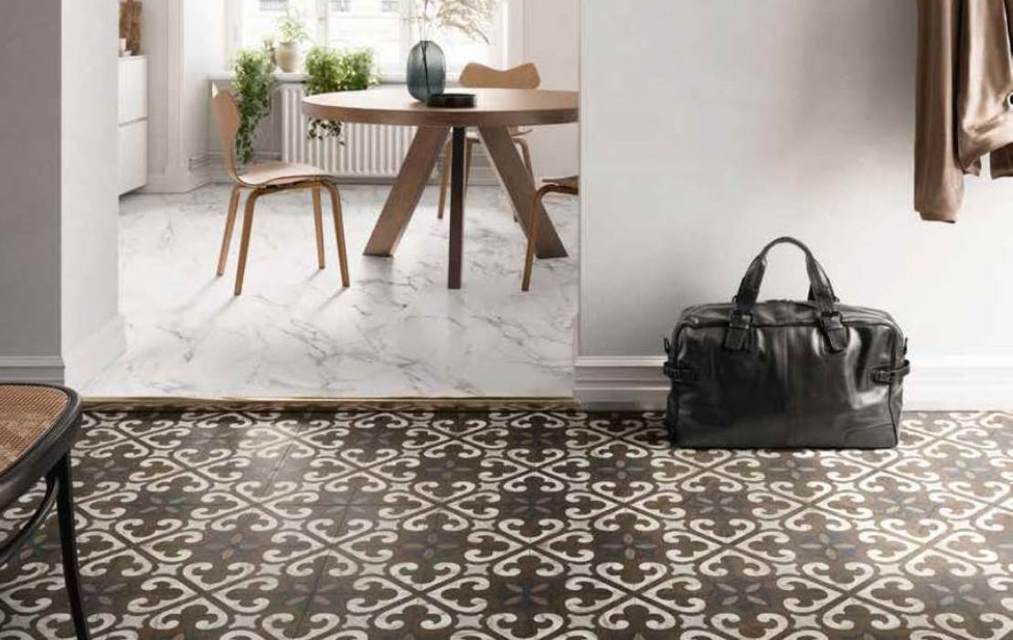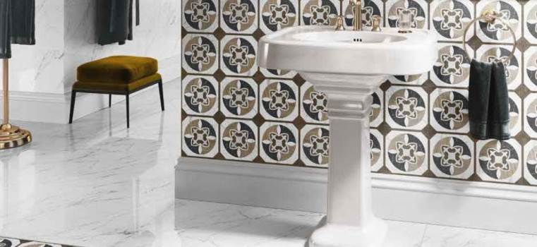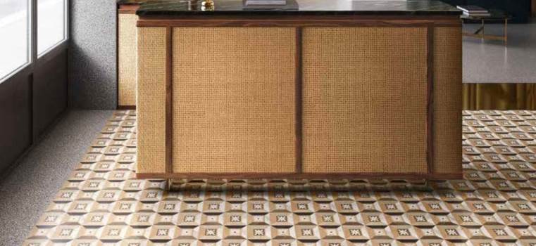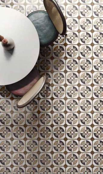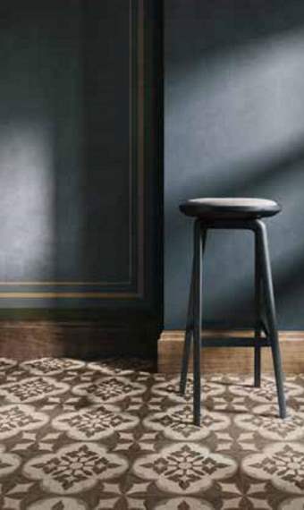 Intarsi è una raccolta di moduli decorativi, legni e marmi, materie e colori reinterpretati da Sant’Agostino nelle sue piastrelle in gres smaltato
